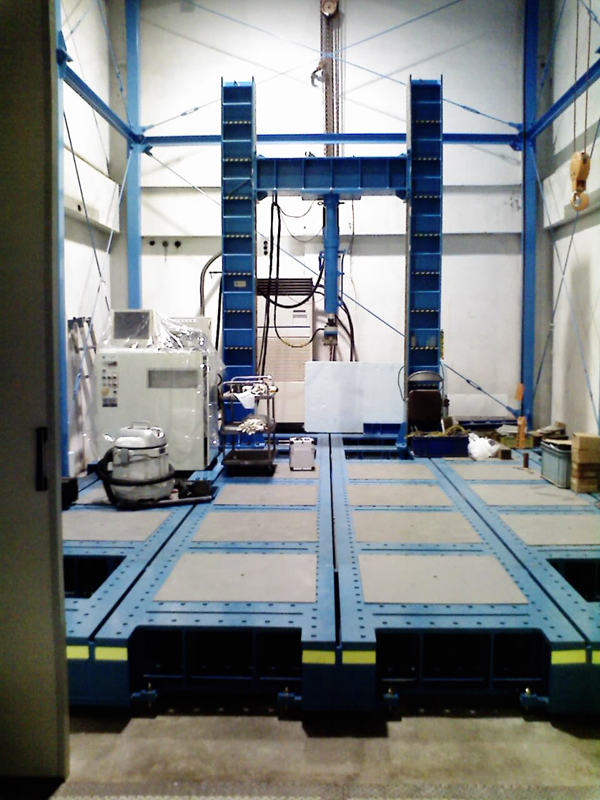 2009年4月、財団法人建材試験センター殿に汎用加力フレームを納入しました。本フレームは、500kNの載荷能力を持つ門型フレームと碁盤目状のベースフレームで構成されています。門型フレームはベースフレーム上で実験に応じて自由に移動・設置することが可能です。