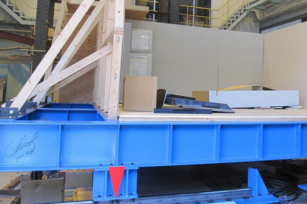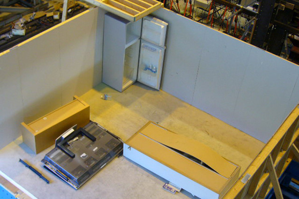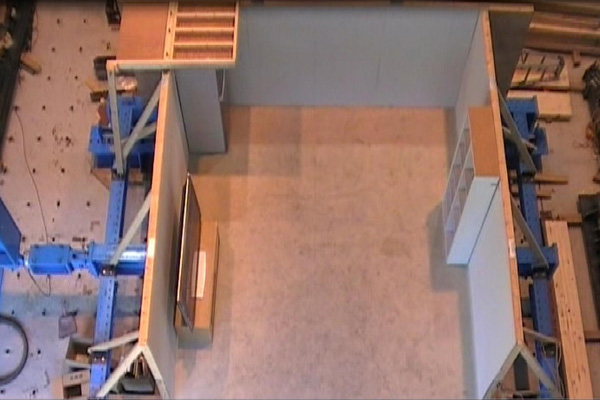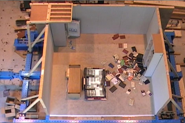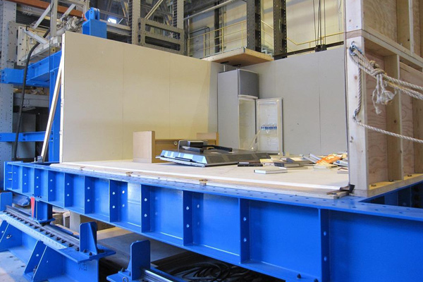 振動台の上に床、壁、テレビや棚といった家庭内の家具を設置し、そこから、揺れを再現することで、家具や内装材、建築設備の耐震性、安全性を研究する目的として使用されています。